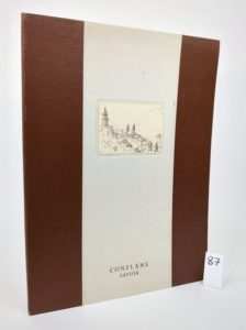 DREVET (Joanny). Conflans - Savoie - 1860-1960. - Ville d'Albertville, 1960. Un volume in-folio [30 x 39.5 cm], (1) f. + 4 pl. non paginées, portefeuille éditeur en skaivertex marron à bandes verticales. « A l'occasion des Fêtes du Rattachement de la Savoie à la France, le Comité d'Albertville a fait exécuter par le Maître Aquafortiste Joanny Drevet une série de 6 eaux-fortes de la Cité Médièvale de Conflans. Ces gravures sont des vues caractéristiques du Vieux Bourg : La porte de Savoie - La Fontaine Louis XIV - L'Eglise de Conflans - La Fontaine Louis XV et la Place - La Grand'Place et la Maison Rouge - La Porte Tarine." Tirage limité à 520 exemplaires. Celui-ci, le n° 195 sur B.F.K. de Rives avec seulement 4 eaux-fortes sur 6 [manquent les deux dernières : 5. La Grand'Place et la Maison Rouge // 6. La Porte Tarine]