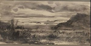 DREVET (Joannès). Marais de Chindrieux et le Colombier. Dessin à la plume et au lavis signé en …
