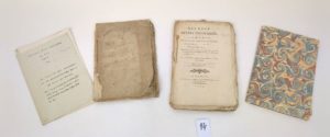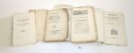 Réunion de 4 fascicules relatifs à la Savoie Oraison funèbre de Charles Emmanuel, roi de Sardaigne et Duc de Savoie, prononcée à Chambéry le 17 mars 1773 par M*** vicaire de la paroisse de St Chambéry, Gombaut, 1773. 45 pages, état moyen [MARSOLLIER des VIVETIERES] : Les deux petits savoyard, comédie en un acte, mêlée d'ariettes, représentée pour la première fois par les Comédiens Italiens ordinaires du Roi, le mercredi 14 janvier 1789. Paris, Brunet, 1789. 70 pages. Etat correct Rapport à M. le chevalier Pullini de S.-Antonin, intendant-gébéral de la Savoie, sur l'essai de paragrêlage qu'il a fait exécuter dans les environs de Chambéry, 1825. Chambéry, Boutin, Bottero et Alessio, 1825. 50 pages, état correct. Lettre d'un Savoyard au roi. 1789. 7 pages. suivi de : La plainte des savoyards, ou la réclamation des droits de tous les peuples. 4 pages. Paris, Knapen, s.d. Bon état.