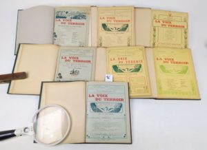 (Vivarais) (Félibre) La VOIX DU TERROIR. Revue mensuelle populaire littéraire, historique & félibréenne. Viviers, Imp. J. Bourg, s.d. [1906-1912], 82 numéros en 7 volumes. Du n° 1 de la première année (7 janvier 1906) au n° 83-84 de la septième année (novembre-décembre 1912), à l'exception des numéros 7 et 75, qui manquent. 17 par 22,3 cm. Demi-toile noire d'époque, plat en toile verte, dos muet, couvertures conservées. (le 7ème volume est relié dans une reliure moderne faite à l'imitation). Excellent état de cette collection. Tout ce qui a paru de cette rarissime revue (à l'exception de deux numéros). Le CCFr. n'en localise que 2 exemplaires complets (B.N.F. ; Béziers, CIRDOC). Publiée à Viviers par l'imprimerie Bourg. Le rédacteur en chef, Joseph Bourg, anima cette revue avec la collaboration, pour la partie provençale, du félibre de Valréas Louis Béchet. Le premier numéro est daté du 7 janvier 1906 et la publication se termina avec le numéro 83-84 de novembre-décembre 1912. Cette revue intéresse essentiellement le secteur vivarois méridional rhodanien, entre La Voulte et Viviers. Très vite, elle prit une certaine importance avec des chroniques, mémoires et légendes sur le Vivarais, signés par les érudits J. Bourg, Morton Fullerton, Sylvestre, Dr Francus, Abbé Roche, R. Labrély, Le Sourd, Louis Pize, etc.. De toute rareté.