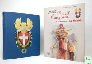 CANZIANI (Estella). Costumes, Moeurs et Légendes de Savoie. Adapté de l'anglais par A. Van Gennep. Chambéry, Dardel, 1920. Un volume in-4 [29 x 23 cm], IX, 1, 105, 1 pages, pleine reliure de l'éditeur en percaline bleue à décor des armes de Savoie. Importante iconographie d'un grand intérêt artistique et documentaire : 47 planches en couleurs contrecollées sur papier cartonné,1 planche d'armoiries en chromolithographie, et vignettes en noir in-texte. En 1905, Estella Canziani, jeune anglaise d'origine piémontaise se rend en Maurienne avec son père en voyage d'agrément De ce voyage, E Canziani a tiré des croquis et des anecdotes de l'époque qu'elle nous livre avec sa vision et ses à priori de l'époque. Ainsi, le mythe du bon savoyard chaleureux et accueillant mais ignorant ressort ici. On apprend toutefois quelques légendes plus ou moins savoyardes, mais ce qui reste de ce livre ce sont les croquis que Miss Canziani a dépeint lors de son voyage. Célébrissime ouvrage, devenu l'un des plus recherchés sur la Savoie. Arnold Van Gennep ayant supervisé l'ouvrage et lui ayant ajouté des matériaux issus de ses propres recherches, indique dans sa préface que l'on peut considérer le présent volume, non pas comme une simple traduction, mais comme une deuxième édition, partiellement refondue, de l'ouvrage anglais. Bel exemplaire. on joint : GUICHONNET (Paul) et FORRAY (François). Le Monde merveilleux d'Estella Canziani. Il était une fois. La Savoie. Montmélian, La Fontaine de Siloé, 2003. in-4 {245 x 340 mm], 247 pages, relié sous jaquette illustrée. Première édition. Un remarquable ouvrage de référence sur cette artiste, avec une biographie détaillée établie d'après ses archives par Paul Guichonnet.
