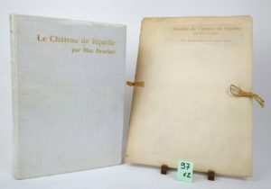 BRUCHET (Max). Le Château de Ripaille. Paris, Delagrave, 1907. Fort in-4 [29 x 21 cm], VIII-648 pages, pleine toile beige de l'éditeur, titre doré sur le dos et sur le premier plat, tête dorée. Edition originale illustrée de 15 héliogravures, d'après des clichés de Fred Boissonnas. "Le meilleur ouvrage sur ce château situé près de Thonon-Les-Bains et sur la Maison de Savoie". On joint le rare portefeuille avec une suite des 14 gravures avant la lettre (il manque le portrait en pied de Mathieu Knecht).