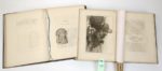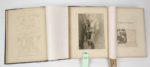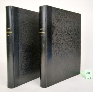 BOITEL (LEON) & LEYMARIE (H.). Album du Lyonnais. Villes, Bourgs, Villages, Eglises et Châteaux du département du Rhône illustrés par H. Leymarie. Lyon, Boitel, 1843-1844. 2 vol. in-4 [22 x 28,5 cm], 298 + 276 pp., bradel demi-veau noir, titre doré, plats recouverts d'une percaline noire moirée. Edition originale de cet ouvrage qui contient au total 32 [15 + 17] superbes lithographies de H. Leymarie [pleine page et en deux teintes] et plusieurs cartes ou plans. Cet ouvrage est bien complet en deux volumes ; il a été précédé d'une première édition en 1842, avec 32 planches et sans aucun texte, sous le titre "Album des Environs de Lyon". Comme noté par Nouvellet [n° 790 de sa vente de 1891] "La planche représentant le château de La Chaise, quoique mentionnée dans la table, n'a pas été publiée". Ceci est confirmé par le propre exemplaire de Boitel dédicacé à Louis Perrin dans lequel cette planche fantôme est également absente, ainsi que sur les 2 exemplaires numérisés de la BML ; et donc la planche 208 de Verzier [citée page 33] n'a jamais existé. Très précieux exemplaire, sur vélin teinté, ayant appartenu à Louis Perrin [n° 739 de sa vente de 1883], avec double envoi "Amico Perrin // Amicus Boitel" au tome 1 et "A son ami Louis Perrin // 31 Xbre 1843 L. Boitel" au tome 2. Il s'agit du tirage de tête, non justifié, sur grand papier vélin teinté, avec tirage des lithographies sur vélin chamois. Le premier volume est complet de la rarissime couverture imprimée en or et rose.