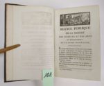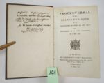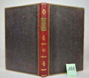 COETLISAN (J.B. Huet, de) - PROCES-VERBAL de la Séance publique de la Société des Sciences et des Arts du département de la Loire Inférieure [à Nantes], du 5 mai 1808. Nantes, Imprimerie de Mme Malassis, 1808. Petit in-8 [13,3x 20,3 cm], 130 pp., demi-maroquin rouge à longs grains, plats de papier violet avec encadrement d'une frise dorée, dos orné de lyres et fleurs dorés (Rel. de l'époque). Discours du président J. B. Huet de Coetlisan avec l'énumération des mémoires reçus par la Société, notice nécrologique du docteur Nouël, Hymne au créateur de Thompson, traduit de l'anglais avec des vers par M. Kérivalant, rapport de M. Athénas sur les fouilles faites à Nantes en 1805, 1806 et 1807 sous la direction de M. Fournier, avec le détail des découvertes archéologiques, diverses pièces en vers et en prose. EXEMPLAIRE DE PRESENT, finement relié avec, sur la garde, un ENVOI AUTOGRAPHE de M. Blanchard de La Musse, rédacteur, secrétaire général de la Société : "présenté à Monsieur Prosper de Barante, auditeur au Conseil d'Etat, préfet du département de la Loire Inférieure, baron de l'Empire, par son très humble et très obéissant serviteur Envoi non daté, sans doute postérieur à la publication du volume, car Prosper de Barante, qui fut sous-préfet de Bressuire de 1807 à 1809, préfet de Vendée de 1809 à 1813 ne sera préfet de la Loire Inférieure qu'en 1813 jusqu'en 1815. Bel exemplaire, de la bibliothèque Barante, avec le petit ex-libris armorié de cette bibliothèque.