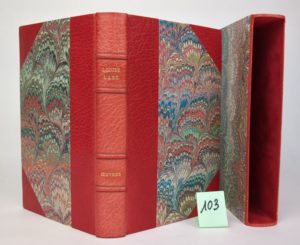 [LABE (Louise)]. OEuvres de Louize Labé. Nouvelle édition publiée par M. Edwin Tross et imprimée en caractères dits de civilité. Paris, Librairie Tross, 1871. In-8 [15,5 x 23 cm], VIII-223 [4] pp., demi-maroquin rouge à coins moderne, dos à 4 nerfs, titre doré, couvertures conservées. Etui bordé de cuir. Jolie édition tirée à seulement 150 exemplaires non justifiés et imprimée en caractères de civilité par Jean Enschedé et Fils à Harlem aux Pays-Bas. Ces caractères avaient été gravés vers 1545 par Amet Tavernier de Bailleul. La préface signée Edwin Tross ["A M. Nicolas Scheuring // libraire-éditeur à Lyon"] fait le point sur l'apparition des caractères de civilité "dont les poinçons et frappes se conservent aujourd'hui dans la fonderie de MM. Enschédé et fils à Harlem". Il ajoute un bref aperçu des premiers livres imprimés avec lesdits caractères. C'est sans doute un des livres où la typographie et le texte forment la plus heureuse association aux fins d'immortaliser les oeuvres de la plus grande poétesse lyonnaise. Vicaire IV 729. Bel exemplaire malgré de légères rousseurs.