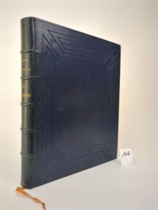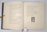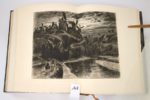 DREVET (Joannès). Eaux-Fortes, pointes sèches et aquatintes dessinées, gravées et imprimées par Joannès Drevet. Lyon, chez l'auteur, 1923. Grand in-4 [27 x 33.5 cm], 59 ff., plein maroquin bleu, dos à 5 nerfs avec titre doré, double filet doré sur les tranches, les 2 plats décorés de doubles filets à froid composant une figure de 4 trapèzes s'entrecroisant, avec un cadre rectangulaire composé de 4 filets à froid parallèles, gardes de papier peint à la cuve, 4 filets dorés encadrant chaque contre plats, tête dorée [reliure signée Jacquet à Lyon]. Ce très rare recueil a été imprimé à 32 exemplaires, tous numérotés et signés par l'artiste. Celui-ci, le n°6. 56 eaux-fortes, pointes sèches et aquatintes de tailles diverses, dont deux à double page. Chaque planche est tirée ou montée sur un feuillet séparé ; entre ces feuillets sont intercalées des serpentes imprimées précisant le titre de chaque épreuve, et son type. Les gravures portent le cachet sec de l'atelier. Menus frottements à la reliure sinon très bel exemplaire.