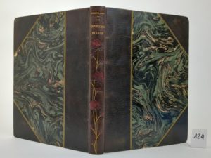 JOSSE (BLETON Auguste, dit Monsieur). Aux Environs de Lyon. Préface de M. Coste Labaume. Edition illustrée de 250 dessins de J. Drevet dont trente-deux grandes compositions hors-texte et une gravure à l'eau-forte. Lyon, Librairie Artistique et Littéraire Dizain & Richard, 1892. Un volume grand in-8 [21.5 x 28.5 cm], IX-358 pages, demi-maroquin brun foncé à coins, dos orné de fleurs mosaïquées avec tiges dorées, titre et tête dorés. Edition originale illustrée de 250 reproductions de dessins de J. DREVET dont 32 hors-texte et une gravure à l'eau-forte [Le Petit Bras de la Saône à Saint-Rambert]. Tirage limité à 875 exemplaires. Celui-ci, un des 10 exemplaires sur papier de Chine [n° 67], avec double épreuve des 32 compositions hors-texte et de la gravure à l'eau-forte. Un classique du régionalisme Lyonnais et sans aucun doute un des plus beaux livres illustrés sur les environs de Lyon. Bel exemplaire à pleines marges, dans une reliure mosaïquée non signée mais attribuable à l'atelier de Lucien Magnin auquel Drevet avait confié ses exemplaires de tête. Légères rousseurs.