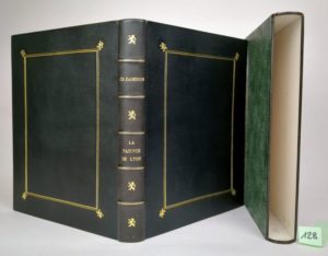 DAMIRON (Charles). La Faïence de Lyon. 1) Première époque. Le XVIe siècle et le XVIIe siècle ; 2) Deuxième époque. Le XVIIIe siècle. Paris, Dorbon Aîné, 1926. Deux textes en un volume, grand in-4 [26 x 33 cm] de (1)f.-XI-68 pages + (3) ff.-50 pages, plein chagrin noir, dos à nerfs orné de lions héraldiques dorés, double filet doré d'encadrement des plats avec lions héraldiques aux écoinçons, tête dorée, couvertures et dos conservés, étui bordé. Édition originale tirée à seulement 525 exemplaires tous sur papier d'Arches, celui-ci n° 398. Important traité sur les faïences de Lyon, orné d'une très belle iconographie : Tome 1 : 68pp. + 26 planches h.-t. (dont 23 en couleurs) sous serpentes légendées. Tome 2 : 50pp. + 16 planches h.-t. en couleurs sous serpentes légendées. Charles Damiron, qui fut bâtonnier du barreau de Lyon, avait rassemblé une importante collection de faïences, majoliques, statues, etc., qui fut répartie entre le Musée des Arts décoratifs de Lyon, et le Musée archéologique de la Tour du Moulin de Marcigny. Très bel exemplaire de cet ouvrage que l'on trouve rarement relié.