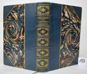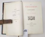 PUITSPELU (CLAIR TISSEUR dit NIZIER DU). Les Vieilleries Lyonnaises. Lyon, chez les libraires intelligents, 1879. Un volume in-12 [14.2 x 21.8 cm], VI+390 pp., demi-maroquin bleu cobalt à coins, doubles filets dorés sur les plats, dos à nerfs richement orné de fleurons et lion héraldiques, tête dorée (reliure signée L. Guétant) Edition originale publiée à compte d'auteur à 200 exemplaires numérotés. Celui-ci, le n°107 sur papier de Hollande. Ce volume contient les articles publiés par Clair Tisseur dans différents journaux ou revues: "les équevilles", "le patois lyonnais", "les bugnes", "les bêches" [qui n'ont rien à voir avec la jardinerie, comme tout lyonnais le sait], et bien complet du "Guide-Ane à l'usage des bonnes gens qui ne sont pas natifs de Lyon pour l'intelligence de quelques mots de l'ouvrage" [c'est ce lexique qui est l'embryon du "Littré de la Grand-Côte"]. Parfait exemplaire relié par Louis Guétant.