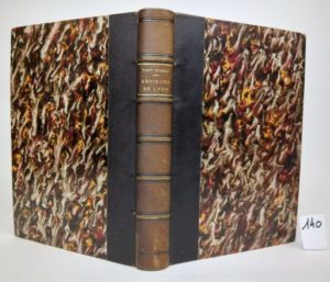 VIBERT (Tony). Tous les Monuments historiques des Environs de Lyon. 100 Eaux-fortes divisées en 20 séries de 5 gravures. Spécialement dessinées d'après nature, et gravées par Tony Vibert Peintre Aquafortiste. Cette collection entièrement inédite, forme l'Album le plus complet et le plus curieux qui soit fait de nos jours ; la petitesse de son format, les soins de son exécution et de son impression le destine tout particulièrement à l'illustration de nombreux ouvrages qui ont été publiés sur la région Lyonnaise. Lyon, Chez les Principaux Marchands [Bernoux & Cumin] et chez l'Auteur, s.d. [1881]. Grand in-8 [17.5 x 25 cm], 110 pl., demi-chagrin, dos à 5 nerfs, titre doré. Rousseurs éparses. 100 eaux-fortes au total [liste jointe à l'ouvrage], toutes portant la mention "ENVIRONS DE LYON', le titre et la signature du graveur. Elles sont regroupées derrière la couverture de la 4ème série. Exemplaire dans lequel a été ajouté les 10 vues spécifiques sur Charbonnières, qui sont très rares car ne faisant pas partie des livraisons courantes. Même si le trait de Tony [Antoine] Vibert [1831-1889] n'a pas la sûreté que Joanny Drevet prouve dans ses propres "Environs de Lyon" publiés quelque temps après [1889], ce recueil reste intéressant pour l'iconographie lyonnaise, et il est devenu rarissime complet car les rares exemplaires complets des 20 livraisons ont la plupart été découpés pour la vente. Le supplément sur Charbonnières est rarissime. Liste des 10 vues de Charbonnières ajoutées : a. Gare et Buffet b. Eglise c. Nouvelle source d. Place e. Entrée de l'Etablissement f. Casino g. Château h. Pont conduisant au Bois de l'Etoile i. Bois de l'Etoile j. Eglise de Marcy.