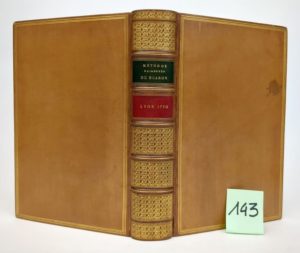 MENESTRIER (Père Claude-François). Nouvelle méthode raisonnée du blason, ou de l'art héraldique. Mise dans un meilleur ordre & augmentée de toutes les connoissances relatives à cette science par M. L*** . Lyon, Pierre Bruyset Ponthus, 1770. Un volume in-8 [12.5 x 18 cm], (10) ff. + 619 pp. + (16) ff., plein veau tabac blond postérieur, dos à 5 nerfs, encadrement doré et finement décorés dans les caissons, triple filet doré sur les plats, toutes tranches dorées (Reliure signée Vve Niedrée). Célèbre manuel héraldique, publié la première fois en 1696. Il est orné d'un frontispice, d'une figure hors-texte pour l'épître dédicatoire, et de 49 planches de figures héraldiques, dont une rempliée, le tout gravé sur cuivre. Les additions de L*** sont dues à Pierre Camille Lemoine. C'est la première édition de cette refonte de la Méthode du Blason du père Ménestrier par Pierre C. Lemoine, archiviste du chapitre de Lyon. Selon une note manuscrite ancienne, ce volume proviendrait de la bibliothèque Guyot de Villeneuve (27 mars 1901), mais il ne figure pas au catalogue de cette vente. Petite tache au premier plat sinon bel exemplaire.