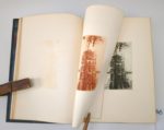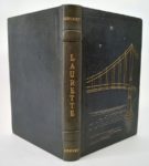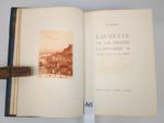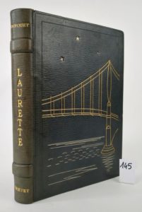 DUFOURT (Jean). Laurette ou les amours lyonnaises. Eaux-fortes et dessins de Joanny Drevet. Grenoble, Editions Didier et Richard, 1929. Un volume grand in-8 [19.5 x 28.5 cm], 132 pages, plein maroquin à grain long vert-de-gris, dos à 2 larges nerfs, premier plat orné d'un décor doré et au palladium représentant la passerelle Saint-Georges, double encadrement à froid sur les plats, tête dorée, couverture conservée (reliure signée Simohel). Edition originale illustrée de 19 eaux fortes de Joanny Drevet, certaines à pleines pages sous serpentes, les autres en tête ou fin de chapitre. Un des 225 exemplaires (n°74) sur Hollande Van Gelder, avec une suite en sanguine des eaux-fortes avant la lettre. Un classique de la littérature lyonnaise présenté dans une élégante reliure.