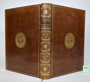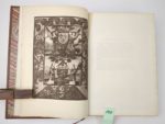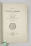 [GUIGUE (Georges)]. L'entrée de François Premier, roi de France en la cité de Lyon le 12 juillet 1515. Publiée pour la première fois d'après le manuscrit de la bibliothèque ducale de Wolfenbüttel. Lyon, Société des Bibliophiles Lyonnais, 1899. Un volume in-4 [22 x 32 cm], xxxix + 180 pp., pleine basane marron, triple filet doré d'encadrement des plats avec, au centre chacun, les armes en doré de la ville de Lyon, dos à 5 nerfs, caissons décorés de lions héraldiques et de fleurs de lys. Reliure signée Louis Guétant. Mors frottés. « Ce livre a été imprimé aux frais de la Société des bibliophiles lyonnais par les soins et sous la direction de M. Léon Galle. Il en a été tiré 150 exemplaires numérotés sur papier de Hollande ». Celui-ci, le n° 47 sur papier de Hollande, avec 14 hors-texte imprimés sur japon.