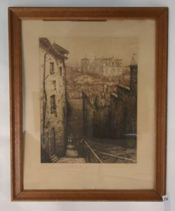DREVET (Joanny). Lyon, montée des Chazeaux. Eau-forte et aquatinte originale tirée en noir et en bistre à 50 exemplaires seulement. Estampe de très grande taille signée en bas à droite au crayon et justifiée en bas à gauche 6/50. Belle vue prise du haut de l'escalier menant à Fourvière, avec au fond la silhouette de la cathédrale Saint-Jean. Dim. (à vue) : 49 x 63 cm. Cadre : 58 x 72 cm.