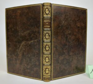 CLAPASSON (André) [RIVIERE DE BRINAIS, Paul]. Description de la Ville de Lyon; avec des recherches sur les hommes célèbres qu'elle a produits. Lyon, Aimé Delaroche, 1741. Un volume petit in-8 [12.5 x 18.5 cm], plein veau marbré postérieur, dos à 5 nerfs richement orné de fleurons dorés dans les caissons, plats entourés d'un double filet doré. Cet ouvrage anonyme, dont le privilège est donné à sieur Paul Rivière de Brinais, ne l'est plus puisque l'on sait qu'il s'agit du pseudonyme utilisé par Clapasson (Revue du Lyonnais, T. VIII, 1838, pp. 142 & Lenglet, Méthode pour étudier l'Histoire, pp. 113). "L'auteur s'était dissimulé derrière le pseudonyme de Paul Rivière de Brinais, ingénieur, qui n'apparaît, et discrètement, que dans le Privilège du Roy, en date du 7 octobre 1740, et dans la cession rapide de celui-ci au libraire, le 12 décembre. André Clapasson, dit Clapasson le cadet, né à Lyon le 13 janvier 1708 fut membre de l'Académie de Lyon. Il avait présenté son ouvrage à cette assemblée le 12 janvier 1739. De la bibliothèque A. Brölemann avec sonex-libris gravé et armorié. Quelques rousseurs éparses.