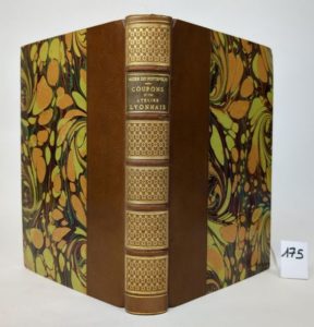 NIZIER DU PUITSPELU (CLAIR TISSEUR dit). Coupons d'un atelier Lyonnais. Préface de Claudius Prost. -Lyon, A. Storck, 1898. Grand in-8 [17 x 25 cm], (2) f., LX pp., 301 pp., (3) f., demi-chagrin havane à coins, dos à 5 nerfs et caissons ornés de fers dorés. Couv. conservée. Edition originale, tirée sur épais papier vélin, avec un portrait de l'auteur [qui manque parfois]. Cet ouvrage est recherché pour la notice biographique sur l'auteur [décédé en 1895] qui est complétée par la bibliographie exhaustive de Clair Tisseur, l'ermite de Nyons, fondateur de l'Académie du Gourguillon. Les pièces éditées ici sont les suivantes : - Une émancipation à Lyon sous l'ancien régime [famille Duraffor, de la mère de Tisseur]. - Histoire du Grand Collège [actuel lycée Ampère] - Nos vieilles enseignes - Comment fut fondée l'Académie du Gourguillon - suivies de 5 articles de "critique littéraire". Exemplaire enrichi d'une lettre autographe de l'auteur datée de 1886, qui ne semble pas concerner l'ouvrage, mais plutôt celui de Clédat sur "la Chanson de Roland", parue également en 1898. Bel exemplaire dans une élégante reliure non signée mais certainement de Henri Jacquet relieur à Lyon entre 1903 et 1962 [voir Rapin, p. 124].