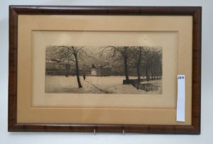 DREVET (Joanny). Lyon, la Place Bellecour sous la neige. 31 novembre 1925. Eau-forte justifiée 149/200 en bas à gauche, signée au crayon en bas à droite. Dim. (à vue) : 25.5 x 49cm. Cadre : 42.5 x 64 cm. (Beccatini 111).