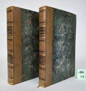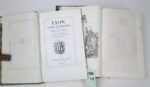 BOITEL (Léon). Lyon ancien et moderne, par les collaborateurs de la revue du Lyonnais, sous la direction de Léon Boitel, avec des gravures à l'eau forte et des vignettes sur bois par H. Leymarie. Lyon, chez l'éditeur, Léon Boitel, 1838-43. 2 vol. gr. in-8 [17.5 x 26.5 cm], XIV-473-(6) et 596 pp., demi-veau blond du temps (reliures de Larchier fils). Edition originale ornée de 30 eaux-fortes hors texte de Henri Leymarie, certaines sur chine appliqué ; texte encadré d'un double filet noir. Bel exemplaire, relié à l'époque en reliures identiques par le relieur lyonnais Larchier fils [inconnu de Fléty, et qui n'a pas été répertorié non plus par Georges Rapin] avec son étiquette sur chaque volume. Exemplaire quasi sans rousseur, ce qui est exceptionnel pour cet ouvrage imprimé sur un papier blanc acide, bien complet en fin de chaque volume de la liste des vignettes et de l'instruction au relieur pour le placement des gravures.