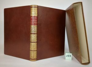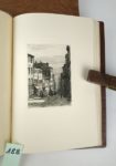 DUFOURT (Jean). Laurette ou les amours lyonnaises. Eaux-fortes et dessins de Joanny DREVET. Grenoble, Editions Didier et Richard, 1929. Un volume grand in-8 [20 x 28 cm], 132 pages, plein chagrin chocolat, dos à faux-nerfs et caissons très ornés de fers dorés, tête dorée, dentelle intérieure à froid, gardes de moire rouge, étui. Couv. conservée. Edition originale ornée d'une eau forte couleurs en frontispice et 18 eaux fortes de Joanny Drevet. Un des 225 exemplaires sur Hollande Van Gelder (n°152) contenant une suite des eaux-fortes avant la lettre tirée en sanguine. Bel exemplaire.