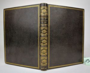 LE LABOUREUR (Claude). Les Mazures de l'abbaye royale de l'Isle Barbe les Lyon ; ou recueil historique de tout ce qui s'est fait de plus mémorable en cette église, depuis sa fondation jusques à présent : avec le catalogue de tous les abbez, tant réguliers que séculiers. Lyon, Claude Galbit, Imprimeur en rue de Belle-Cordière, 1665. Petit in-4 [16.5 x 22 cm], (30)-316 p. + (3) ff., plein maroquin noir, dos à 5 nerfs avec caissons décorés et dorés, triple filet doré d'encadrement des plats, large dentelle intérieure dorée, toutes tranches dorées (reliure signée B. Magnin). Rare édition originale des Mazures, dans sa première impression avec le titre à la corbeille de fleurs, et la dernière page numérotée 516 par erreur [qui indique la future édition d'un volume supplémentaire qui ne sera publié à Paris qu'en 1681, et ne contiendra en fait que des preuves ] L'ouvrage se termine avec la "Liste de quelques moines de l'Isle, extraits de divers Titres, selon les temps auxquels ils ont vécu" (les 3 derniers feuillets uniquement, dont le dernier titré "Additions et corrections" ; les deux manquant sont remplacés dans cet exemplaire par des photocopies d'après l'exemplaire bnf.)" Très belle reliure en plein maroquin due au relieur lyonnais Barthélémy Magnin