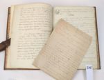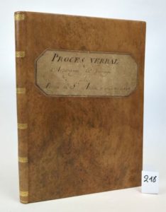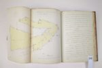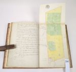 Procès verbal d'Arpentage & Bornage de la ferme de St Aubin es années 1807 et 1808. Un volume. 20 par 29 cm. 109 pages. Pleine basane moderne, titre ancien collé sur le 1er plat. Très bon état de la reliure, Très bon état intérieur (une page légèrement tachée, diverses annotations au crayon à papier indiquant les changements sur les relevés). La Ferme Saint Aubin est la commune située dans l'Essonne. 8 plans dépliant ou pleine page en couleurs, très nombreux croquis en couleurs dans le texte. Détermination du bornage de tous les propriétaires adjacents des terres concernées, avec leur accords signés. Très beau document