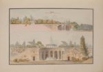 Armand Parfait PRIEUR et Pierre Louis VAN CLÉEMPUTTE, Collection des prix que l'académie d'architecture Paris, Van Cléemputte, [1787]-1797, 1 vol. in-folio : titre, frontispice (vue du théâtre des variétés et avertissement), 20 cahiers de 6 pl. sauf le cahier 18 qui en compte 7, soit 121 pl., 1 f. de table. Exemplaire imprimé sur papier de Hollande, sauf le feuillet de table qui présente des rousseurs. Enrichi de 4 pl. dont 3 rehaussées (Cahier 4, pl. 6, cirque de la ménagerie par Percier, 1 pl. alternative et 2 rehaussées ; cahier 13, pl. 4, grotte par Percier, 1 pl. rehaussée). Reliure demi-veau bordeaux vers 1830, mors et coiffes usés, coins remplacés. Très importante publication qui débuta sous l'ancien régime et qui avait pour unique vocation de publier les projets des candidats aux Grands Prix d'architecture. On y retrouve tous les grands noms de l'architecture des 50 ans qui suivront, à un moment de leur vie où ils étaient encore astreints aux concours en loges.