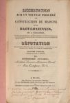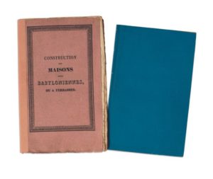 Louis SCHWICKARDI, Dissertation sur un nouveau procédé de construction de maisons dites babyloniennes, par Schwickardi, architecte, inventeur mécanicien, breveté, rue Castiglione n° 7 ; Dissertation sur un nouveau procédé de construction de maisons dites babyloniennes, par Schwickardi, architecte, inventeur mécanicien, breveté, rue Castiglione n° 7. Paris, l'auteur, 1825 & 1828. 2 plaquettes in-8° : 32 p. (cahier dérelié). Couverture en papier bleu ; couverture originale imprimée sur papier rose conservée (restaurée) et 48 p. Longue liste manuscrite de l'auteur en bas du titre et au verso déclinant la liste de ses activités. Réunion des deux éditions de cette plaquette rare et curieuse protégées dans une boite toilée grise moderne. Entrepreneur et inventeur Schwickardi [prononcer Suicardi] s'efforça de développer à Paris un système innovant de toitures en terrasse, qu'il voulut diffuser en faisant imprimer la brochure dont les deux éditions sont ici réunies.