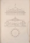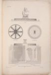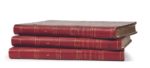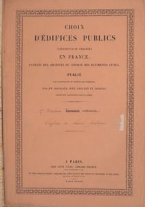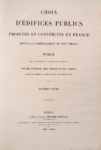 Jean Marie Dieudonné BIET, Charles Pierre GOURLIER, Edme Jean Louis GRILLON et Jean Jacques TARDIEU, Choix d'édifices publics projetés et construits en France depuis le commencement du xixe siècle. Publié avec l'autorisation du ministère de l'Intérieur, par MM. Gourlier, Biet, Grillon, et feu Tardieu, architectes, membres du conseil des bâtiments civils. Premier [Deuxième ; Troisième] volume. Paris, Louis Colas, Carilian-Goeury, 1825-1836 [1837-1844 ; 1845-1850]. 3 vol. in-folio : [vol. 1] 25 p., « tableau général » à double page, 128 pl., des éléments volants ajoutés à partir de livraisons (2 couvertures de livraison, 2 f. ajoutés de faux-titre, imprimé au verso, et titre, 2 f. version alternative de l'avant-propos, 12 pl. en double). Quelques rousseurs modérées, petites mouillures claires marginales, dont une en gouttière des dernières planches ; [vol. 2] faux-titre, imprimé au verso, titre, 36 p., « tableau général » à double page, 132 pl., des éléments volants ajoutés à partir de livraisons (2 couvertures de livraison, 2 pl. en double). Rousseurs modérées ; [vol. 3] 42 p. y compris le faux-titre, imprimé au verso, et le titre, « tableau général » à double page, « tableau général des 3 vol. » à double page, 124 pl., 6 pl. volantes en double ajoutées à partir de livraisons. Rousseurs modérées et petites mouillures marginale. La qualité du papier varie. Reliures demi-maroquin rouge, têtes dorées. Dos en parfait état, mais plats partiellement endommagés. Intéressant travail de recensement des principales réalisations soumises à l'approbation du Conseil des bâtiments civils, soit les principaux projets financés avec des deniers publics. Les recueils, qui sont classés par grandes catégories de programmes, donnent ainsi une image complète de la politique d'équipement de la France dans les deuxième et troisième quarts du XIXe siècle.