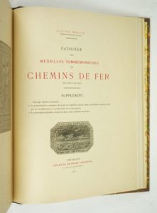 [Numismatique][Chemins de fer] MOYAUX (Auguste) : Les chemins de fer autrefois et aujourd'hui et leurs médailles commémoratives. Notice historique suivie d'un catalogue descriptif des médailles de tous les pays. Ouvrage illustré hors texte et dans le texte, accompagné de onze planches en phototypie. [Avec le Supplément au catalogue des médailles]. Bruxelles, Charles Dupriez, 1905-1910. Un volume. 23,5 par 31 cm. 1 portrait compris dans la pagination-XII-262 pages + 3 planches h.t. (dont 1 sur double page) + 11 planches h.t. de médailles et 1 frontispice-(4)-II-127 pages + 3 planches h.t. (pour le Supplément). Demi-chagrin chocolat moderne, dos 5 nerfs. Ouvrage en très bon état. Edition au tirage limité à 425 ex. ici un exemplaire numéroté sur vélin (375). Le supplément contient 1° La nomenclature sommaire de toutes les médailles décrites dans le précédent catalogue ainsi que les modifications et rectifications à ces descriptions. 2° La description détaillée d'environ deux cents médailles nouvelles. Ouvrage de référence.