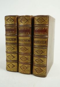 Réunion très rare de deux impressions de Strasbourg [Pharmacie] [Botanique] 1) HERMANN (Paul) : Cynosura materiae medicae, ante sedecim annos in lucem emissa, brevibusque annotatis exornata a Dn. Joh. Sigismundo Henningero [], nunc diffusius explanata, et compositorum medicamentorum recensione aucta, curante Johanne Boeclero []. Argentorati [Strasbourg], Sumptibus Johannis Beckii, 1726. Un volume. (16)-728-154-(mal ch. 148)-(6) pages. 2) BOECLER (Johann) : Cynosura materiae medicae continuata, ad cynosurae materiae medicae Harmannianae imitationem collecta. Argentorati, Sumptibus Johannis Beckii, 1729-31. 2 volumes. (12)-891-(16) ; (8)-894-(21) pages. Soit 2 ouvrages en 3 volumes de 15,5 par 20 cm. Pleine basane d'époque, dos 5 nerfs, caissons ornés, pièces de titre et de tomaison rouges. Une coiffe supérieure arasée, petites épidermures très légères sur 3 plats, restaurations mineures et anciennes. Petits tampons d'ancienne appartenance sur les pages de garde. Malgré cela, belle condition de ces reliures. Papier en partie roussi, sinon très bon état intérieur. 1) 3e édition, la plus complète (E.O. : 1710). Conlon 26 : 462 ; European Americana VI-726/104. "Includes articles on balsamum peruvianum, cacao, jalap, mechoacan, tacamahac, etc., mentioning their American origin." (European Americana). "Hermann (Paul), botaniste allemand, né à Halle, le 30 juin 1646, mort à Leyde, le 29 janvier 1695. On doit à Hermann la description de beaucoup de végétaux des Indes, inconnus avant lui, ainsi qu'une meilleure classification, d'après la méthode Morison. " (Hoefer, Bibliographie XXIII-col. 358). Il fit un long voyage à Ceylan 2) Edition originale. Conlon 29 : 342 ; European Americana VI-729/25. "Vol. 1 includes articles on Botrys mexicana, ipecacuanha, Parreira brava, & yucca." (European Americana). "Boecler (Jean), médecin et botaniste, né à Strasbourg le 6 novembre 1681, étudia la médecine et la botanique. Reçu docteur en médecine le 23 avril 1705, il fut appelé, dès 1708, à la chaire de physique à l'université ; à cette occasion, il fit son oratio de chymiae cum physica conjunctione. Promu au doctorat en philosophie, Boecler devint professeur public ordinaire d'histoire naturelle, en 1711" (E. Stitzmann, Dict. de biographie des hommes célèbres d'Alsace, p. 183). Le livre de BOECLER se veut la continuation de celui d'HERMANN, d'où la réunion des deux ouvrages.