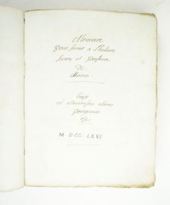 [manuscrit] LAPLATTE (Abbé François) : Mémoires pour servir à l'histoire sacrée et profane de Macon - Turpe est Atheniensem preregrinum esse - 1766. Un volume. 19 par 25,5 cm. (12)-564 pages, suivies d'une centaine de feuillets vierges. Cartonnage d'époque relié en papier marbré d'attente. Texte manuscrit sur papier bleuté, très lisible, avec quelques ratures, et des notes additionnelles en marge. Il est en parfait état. On joint une lettre manuscrite adressée à l'Abbé LAPLATTE, contenant une précision sur une note érudite de la terre de Leyne en 1363. Lettre adressée à Monsieur La Platte, ancien curé de l'hesne, près de l'église Saint-Pierre à Mâcon. Un manuscrit du même ouvrage se trouve à la Bibliothèque municipale de MACON, et a été transcrit dans le Hors-série N°2 des Etudes Mâconnaises en septembre 2017. Mais le manuscrit que nous présentons n'est pas une copie identique à celui transcrit. On peut supposer qu'il s'agit d'une première version du texte, repris et augmenté plus tard. Pour indice, le manuscrit détenu par la ville de MACON est daté de 1768, le nôtre de 1766. Notre manuscrit s'arrête vers la date de 1702, par un trait en bas de page le cloturant, pour les éléments qui y sont relatés, alors que le manuscrit transcrit va jusqu'aux débuts de la Révolution. Dans la préface, notre exemplaire cite Grégoire de Tours, et le Livre enchainé des archives de Saint-Vincent. Deux sources ignorées par le manuscrit de Macon, qui y ajoute, lui, Guillaume Paradin. Notre exemplaire est souvent moins détaillé que le texte retranscrit, et cela semble confirmer l'hypothèse d'une première version du texte. En voici un exemple : « Un des curés du diocèse qui remplit le mieux les pieuses vues de Mr Leveque fut Mr de Boisfranc curé de Bussières : voyez brochure ». dit notre exemplaire (page 456) « Un des curés qui remplit fort bien les saintes vues de Mr l'évêque fut monsieur de Bois Franc, curé de Bussières, qui ayant été luy même calviniste connoissoit mieux les erreurs du party. Son application à l'étude luy fit connoitre qu'il étoit dans un égarement déplorable ; il bénit Dieu de luy avoir dessillé les yeux, abjura généreusement ses erreurs et voulut comme un autre Paul défendre des vérités qu'il avoit si honteusement combattus. Il entra dans le clergé. On connut ses talents, et Bussières luy ayant été confié, il fit rentrer dans le sein de l'église un grand nombre de calvinistes. » est la version du manuscrit de 1768 (page 196 de sa transcription). Puis le texte se poursuit par un paragraphe, lui identique dans les deux manuscrits. On joint le Hors-Série N°2 des Etudes Mâconnaises où l'exemplaire de 1768 de l'Abbé LAPLATTE a été retranscrit. Un document unique et exceptionnel.