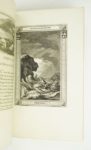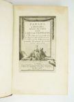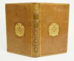 [Reliure armoriée] : LA FONTAINE (Jean de) : Fables choisies. Nouvelle édition gravée en taille-douce. Les figures par le Sr. Fessard. le texte par le Sr. Montulay. Dédiées aux enfans de France. Paris, chez l'auteur, 1765-1775. 6 volumes. 12,5 par 20 cm. Frontispice, titre gravé, LXXI-(2)-100 ; VI-102 ; IV-(2)-95 ; (6)-134 ; (6)-103 ; (6)-115 pages. Plein veau blond glacé d'époque, dos 5 nerfs, caissons ornés entre autres de lions, plats avec un triple encadrement de filets dorés, filet sur coupes, roulette intérieure, toutes tranches dorées. Plats aux armes de Emmanuel-Félicité de DURFORT, Maréchal-Duc de Duras (1715-1789). Quelques frottements, un petit choc à la coiffe supérieure du tome 1, une éraflure sur le second plat du tome 2, sinon bel état de la reliure. Une gravure avec une marge plus courte (sans manque), une autre très légèrement roussie, sinon très bel état intérieur. Premier tirage de cette édition de luxe, entièrement gravée sur beau papier vergé et illustrée de 724 compositions : 6 titres illustrés, 1 frontispice, 2 bandeaux armoriés, 242 bandeaux, 247 hors-textes ou pleines pages et 226 culs-de-lampe gravés par Fessard d'après Loutherbourg, Houël, Desrais, Leprince, Caresme, Monnet, etc. Une des plus belles éditions des Fables de La Fontaine, entreprise par le graveur Étienne Fessard. Pour Bibliophile