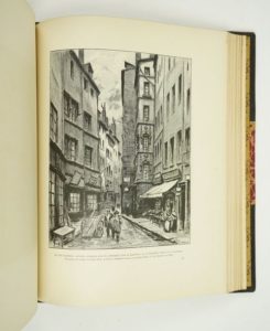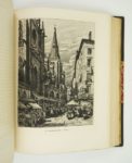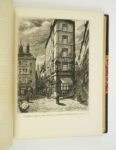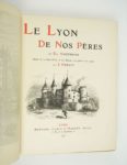 VINGTRINIER (Emmanuel) : Le Lyon de nos pères. Illustré de 20 eaux-fortes et 300 dessins à la plume et au crayon par Joannès DREVET. Lyon, Bernoux, Cumin et Masson, 1901. Un volume 24,5 par 31,5 cm. VIII-334-(2) pages + 20 eaux-fortes hors-texte + 1 planche h.t. sur double page. Demi-chagrin brun à coins d'époque, dos lisse très joliment décoré, couvertures conservées, tête dorée. Quelques frottements discrets sur la coupe du plat supérieur, sinon très bel état de la reliure, et excellent état intérieur. Le plus recherché des ouvrages de DREVET. Il est illustré de 20 eaux-fortes et de 300 dessins à la plume et au crayon. Grand ouvrage classique permettant de visiter le LYON de l'Ancien Régime Edition originale. Ici un des exemplaires numérotés sur vélin blanc (N°392), dans une belle reliure.
