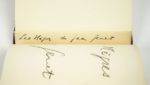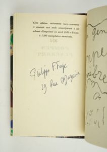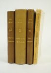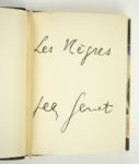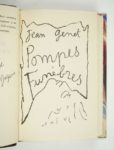 GENET (Jean) : Notre Dame des fleurs. Lyon, l'Arbalète, 1948. Un volume. 13,5 par 18,2 cm. 413 pages. Un des exemplaires du tirage limité in-seize jésus sur pur fil lana filigrané l'Arbalète. Demi-chagrin brun d'époque, dos lisse, dos de la jaquette conservé. Dos de la reliure insolé, parfait état intérieur (le dos conservé est bruni, seul défaut mentionnable). Avec GENET (Jean) : Pompes funèbres. S.n., s.l., avril 1948. Un volume. 11 par 18 cm. 375 pages. Demi-chagrin brun d'époque, dos lisse, couvertures illustrée intégralement conservée. Dos de la reliure insolé, état intérieur à l'état de neuf. 2ème édition, non mise dans le commerce, tirée à 1500 ex. Celui-ci N° 566. Titre gravé par COCTEAU. Ancienne appartenance manuscrite (Philippe Fourneau FAYE). Avec GENET (Jean) : les nègres. Décines, l'Arbalète, 1958. Un volume. 13,5 par 18,5 cm. Demi-chagrin brun d'époque, dos lisse, couvertures et dos conservés. Dos de la reliure insolé, parfait état intérieur. Un des 3200 exemplaires de l'édition originale tirée sur Lana, filigrané L'Arbalète (N°534). Avec PERISSET (Maurice) : Corps interdits. Illustrations de Jean BOULLET. Paris, la Salamandre, 1954. Un volume. 13,5 par 19 cm. 158 pages. Broché, en parfait état. Edition originale, un des 200 exemplaires sur alfa-mousse navarre (179). Exemplaire enrichi d'un envoi manuscrit de l'auteur à Philippe Fourneau FAYE. Les trois ouvrages de GENET sont reliés de manière uniforme. Le volume de Périsset complète cette collection.