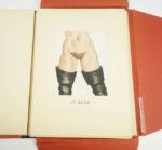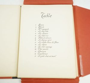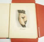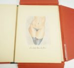 [Curiosa] CHIMOT (Edouard) : Chats. Paris, à l'enseigne de l'auteur qui ne veut pas dire son nom, 1932. Un volume. 28 par 39,5 cm. (8) pages, suivi de 15 lithographies originales en couleurs d'Edouard CHIMOT, sous cache avec légendes spirituelles (Brune, Blonde, A l'espagnole, le Chat botté, les Siamois, le Chat noir, Patte de velours, le Chat qui dort, la Chatte bleue de Perse, le chat sauvage, etc. Complet. Portefeuille rouge à rabats d'origine. Plat décoré d'un dessin de chat, évocateur. Dos restauré par une demi-toile noire. Portefeuille un peu passé, excellent état des lithographies. Les pages préliminaires donnent la table des illustrations, et le justificatif de tirage. Exemplaire numéroté sur Hollande (78), sur un tirage total de 250 exemplaires vendus à de discrets amateurs Un livre qui mêle érotisme et humour, avec le talent de CHIMOT