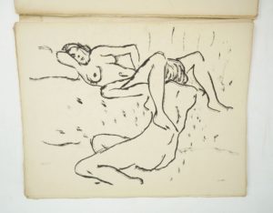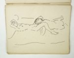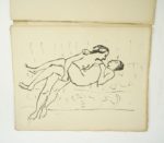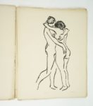 [curiosa] : MARQUET (Albert) : L'Académie des Dames. Vingt attitudes par Albert Marquet. New-York, Sixtin-ninth avenue, s.d. (circa 1950). Un volume. 25,5 par 33 cm. Chemise illustrée et imprimée contenant 19 planches érotiques d'Albert MARQUET (sur 20). Dos de la chemise avec quelques coupures sans gravité, excellent état intérieur. 19 planches hors-texte érotiques, plus deux in-texte. Ces attitudes illustrent un poème de Verlaine « tendre, la jeune fille rousse,  » reproduit dans le recueil. Un des 300 exemplaires numérotés sur Vélin d'Arches (36). Recueil paru en édition privée non mise dans le commerce.