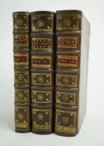 [Chimie][Pharmacie] GEOFFROY (Etienne-François) : Tractatus de materia medica, sive de medicamentorum simplicium. Historia, virtute, delectu & usu. Parisiis, Joannis Desaint & Caroli Saillant, 1741, 3 volumes. 12 par 19,5 cm. (4)-197-(3)-318-(6) pages + 1 pl. dépliant h.t. ; (4)-794-(6) pages et (4)-836 pages. Plein veau d'époque, dos 5 nerfs, caissons ornés, pièces de titre et de tomaison rouges. Petites restaurations anciennes et bien exécutées, très bon état de la reliure. Papier parfois légèrement roussi. 1) De fossilibus ; 2) De vegetabilibus exoticis ; 3) De vegetabilibus indigenis. Edition originale. Conlon 41 : 497 ; European Americana 741 : 93 ; Muller, Biblio. des Kaffee 91. "Previously 1st published, London, 1736, as Geoffroy's "A treatise of the fossil vegetable, and animal substances that are made use of in physick", which purports to be based upon a ms. of the author's lectures. American plants include balsam of Peru, cacao, ipecacuanha, Jamaica pepper, Virginian snakeroot, etc.." (European Americana). "Etienne-François Geoffroy, originaire de Paris, fut maître apothicaire puis docteur en médecine de Paris. Geoffroy propose une classification des substances chimiques suivant leur plus ou moins grande « disposition à s'unir » à une substance de référence. L'idée que certaines substances puissent s'unir plus facilement que d'autres n'était pas nouvelle, mais le crédit de réunir toutes les informations disponibles dans un grand tableau général, appelé plus tard table d'affinité, en revient à Geoffroy. La controverse qui l'oppose à Louis LEMERY, un de ses collègues de l'Académie, témoigne de la nouvelle manière de pratiquer la science où chacun avance une conjecture qu'il essaie de corroborer par des expériences et propose de nouvelles expériences cherchant à réfuter la conjecture adverse. Ce nouvel art du débat scientifique va permettre d'établir sur des bases solides la science chimique en gestation