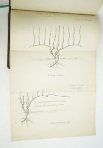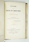 Ensemble de trois ouvrages XIXe en deux volumes sur la vigne. LAFITTE (Prosper de) : Quatre ans de lutte pour nos vignes et nos vins de France. Mémoires, opuscules et articles. Paris, G. Masson et Bordeaux, Féret et Fils, 1883. Un volume. 16,5 par 26,5 cm. 1 portrait-(4)-XIII-(3)-596 pages. Broché, sous couverture imprimée. Bon état général. Première et seule édition collective. Chwartz L : 12 ; manque à Simon ; pas d'ex. dans la collection Fritsch ; N.U.C. : -NL 25535- (NjR ; CU ; CU-A). Réunion des écrits que Prosper Lafitte publia pour défendre la méthode de lutte contre le phylloxéra, préconisée par le physiologiste Edouard-Gérard Balbiani. Le portrait de Balbiani ne se trouve que dans les exemplaires offerts par l'auteur. AVEC 1) LABORIER (Abbé F.) : Nouveau mode de plantation et nouvelle culture de la vigne. Moyens faciles et peu coûteux de régénérer les plants phylloxérés et de conserver les vignes encore intactes. Lille, Imprimerie et Librairie Salésienne (Oeuvre de Dom Bosco), 1886, 208 pages. Une appartenance manuscrite à Antoine Laborier. suivi de 2) VIAS (A.) : Culture de la vigne en chaintres. Deuxième édition entièrement revue et considérablement augmentée. Paris, Librairie Agricole de la Maison Rustique ; Chissay, Chez l'Auteur, 1875. (4)-80-(1) pp. + 9 pl. dépl. h.t. (dont 1 à pleine page). Qq. illustrations in-texte. Marge légèrement abimée pour deux des gravures dépliantes, sans manque ni gravité. Soit 2 ouvrages en 1 volume. 13,5 par 21,5 cm. Demi-chagrin lie de vin d'époque, dos 5 nerfs. Reliure en bon état (petites usures des coins inférieurs). Rousseurs éparses. 1) 2e édition revue et augmentée en partie originale (E.O. : 1884, en 132 pp.). Livre rare. Pas d'exemplaire au CCFr. et au Worldcat ; manque à Chwartz. Dans cette édition, l'abbé Laborier entend répondre aux objections qui se sont élevées à propos de son traitement au suif contre le phylloxéra. Il consacre également un chapitre à la vigne américaine. 2) La première planche est accompagnée d'un f. de légende dépl.. 2ème édition, "entièrement revue et considérablement augmentée" (E.O. : 1869). "Mode de culture pratiqué après le phylloxéra, surtout dans le Loir-et-Cher." (Lachiver, Dict. du monde rural p. 399) Dit aussi vignes trainantes, il "consiste à planter des rangs de vignes à 6 mètres de distance l'un de l'autre et à les cultiver à la charrue." (Vias p. 12), inventé par Denis-Lusseaudeau, dit le Père Denis, vigneron à Chissay (Loir-et-Cher).
