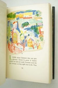ROBLÈS (Emmanuel) : Le Grain de sable. Lithographies de Roger BEZOMBES. Paris, Éditions de l'Empire, 1955. Un volume. 18,5 par 27,5 cm. 97 pages. Plein chagrin noir, tête dorée, couvertures et dos illustrés conservés, Etui bordé et doublé. Reliure signée Christian GREGOIRE. Parfait état de l'ouvrage. Edition originale illustrée de 10 lithographies originales en couleurs de Roger Bezombes, certaines à double page. Tirage à 300 exemplaires, celui-ci l'un des 260 sur papier vélin d'Arches (n°141), signé par l'auteur et l'artiste. Une très belle illustration, dans une reliure simple mais parfaite.