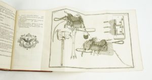 LA PORTERIE (François de) : Institutions militaires pour la cavalerie et les dragons. Paris, Guillyn, 1754. Un volume. 12 par 19,5 cm. XIV-(2)-439-(1) pp. + 11 pl. dépliantes h.t. (complet). Plein veau d'époque, dos 5 nerfs, caissons ornés, pièce de titre rouge, filet sur coupe. Petits froteements en haut et en bas du dos, sinon très bel état de la reliure. Rarissimes piqûres, rousseurs sur une planche, sinon excellent état intérieur. Edition originale. Conlon 54 : 784 ; Mennessier de La Lance, Bibliographie hippique II-p. 48. L'auteur a été successivement mestre de camp des dragons, lieutenant-colonel, brigadier, gouverneur de la citadelle d'Arras, commandant de l'École d'équitation de Cambrai, lieutenant-général. "Ce livre est un véritable aide-mémoire donnant des détails sur l'habillement, l'équipement, le harnachement, le campement, l'armement, etc. des cavaliers et des dragons ainsi que des notions d'hippologie, d'équitation et de dressage. Les nombreuses figures contenues dans les 11 planches représentent ces différentes parties." (Mennessier de La Lance).