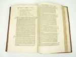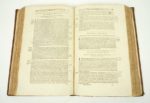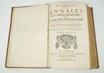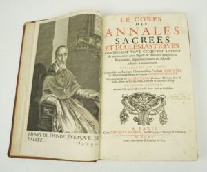 BARONIO (César, Cardinal) et SPONDE (Henry de, Evêque) : Le corps des annales sacrées et ecclésiastiques contenant tout ce qui est advenu de mémorable dans l'Eglise & dans les Empires & Royaumes, depuis la création du monde jusques à maintenant. Mises en français par Pierre COPPIN, (). Seconde édition. Paris, Jacques d'Allin, 1655. Un volume. Frontispice-(24)-530-(60) pages. Suivi de : SPONDE (Henry de, Evêque) : Abrégé des Annales écclésiatiques de l'Eminentissime Cardinal Baronius. Paris, Jacques d'Allin, 1655. Quatre tomes en deux volumes. Frontispice gravé-(33)-944-(138) ; (4)-662-204-(96) pages Suivi de : SPONDE (Henry de, Evêque) : Continuation des Annales ecclésiastiques du cardinal Baronius, composées en latin par Mre Henry de SPONDE, () mises en françois par Pierre COPPIN. Paris, Jacques d'Allin, 1654. 3 volumes. (16)-754-(66) ; (2)-766-(51) ; (2)-760-30-(59) pages. 6 volumes au total (complet), avec une tomaison unique en 6 volumes. 22 par 36 cm. Pleines reliure d'époque, dos 6 nerfs, caissons ornés. Reliures présentant de nombreux petits défauts : coins usés, épidermures sur les plats, mais pas de défauts importants. Rousseurs. Tome 2 avec des mouillures. Très petit trou de ver dans quelques pages de la table du tome 1. César BARONIO veut, par son oeuvre, inciter à une méditation permettant d'approfondir sa foi religieuse, et, accessoirement, de contrer le protestantisme. Mais dès leur parution, ce recueil historique de tous les faits chrétiens dignes d'intérêt va servir de mine d'informations pour toutes les hagiographies et les légendes pieuses que l'Eglise diffusera durant des siècles. Malgré son importance, il est rare de trouver cette oeuvre avec l'ensemble des prolongements faits par Henry de Sponde. Bien complet du supplément qui couvre de 1640 à 1654, rédigé par COPPIN.