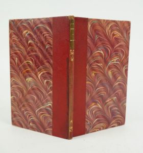 MUSSET (Alfred de) : Bettine, comédie en un acte et en prose. Paris, Charpentier, 1851. Un volume. 11 par 18,5 cm. 71 pages. Demi-chagrin rouge d'époque, dos lisse, avec des décors romantiques et une pièce de titre havane, couvertures conservées. Petits frottements sans gravité sur qq cms du mors supérieur, trace noire sur e mors inférieur, sinon reliure en bon état. Quelques rousseurs. Edition originale de cette pièce de Musset, ici dans une reliure ayant conservé les couvertures originales.