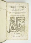 [ésotérisme] NOSTREDAME (Michel de) : Les prophéties de M. Michel Nostradamus. Dont il y en a trois cens qui n'ont jamais esté imprimées. Ajoustées de nouveau par ledit autheur. Lyon, 1698. Un volume. 8 par 14,5 cm. (12)-177-(1) pages. Demi-vélin d'époque, plats en papiers marbré d'époque, titre manuscrit sur le dos. p. ; cartonnage muet XVIIIe, titre manuscrit sur le dos. Petit travail de vers dans la marge inf. de 1/3 des feuillets sans atteinte du texte, et sans gravité, rousseurs éparses. Portrait de l'auteur gravé sur la page de titre. Benazra p. 279 : édition n°96 des Centuries. Edition populaire de ce texte recherché pour ses prédictions