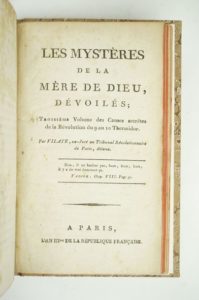 Une des sources de Babeuf [Terreur, Robespierre] VILATE (Joachim) : Causes secrètes de la Révolution du 9 au 10 thermidor. Paris, l'an III [1795] suivi de VILATE (Joachim) : Continuation des causes secrètes de la Révolution du 9 au 10 thermidor. Paris, l'an III [1795]. suivi de VILATE (Joachim) : Les mystères de la mère de Dieu, dévoilés ; troisième volume des Causes secrètes de la Révolution du 9 au 10 thermidor. Paris, l'an IIIme [1795]. Trois ouvrages en un volume. 11 par 19 cm. 70 ; 71 ; (2)-96-(1) pages. Cartonnage bradel moderne en parfait état. Rousseurs sur quelques feuillets. Editions originales pour les trois textes. La réunion de ces trois brochures est très rare. Tourneux 4302 ; Fierro 1468 ; Martin et Walter 33568, 33569 et 33570. Vilate "entra d'abord dans les ordres, enseigna dans plusieurs collèges, puis vint à Paris en 1792 pour suivre des cours de médecine. Il troqua son prénom contre ceux de Sempronius Gracchus, fréquenta les Jacobins, fit connaissance de Barère, Vadier, Saint-Just, Robespierre [dont il fut le protégé et l'informateur], et fut nommé, le 28 septembre 1793, juré au Tribunal révolutionnaire. Par ses propos imprudents, il s'attira l'inimitié de Billaud-Varenne, fut arrêté le 3 thermidor par ordre du comité de sûreté générale, incarcéré à la Force, puis au Luxembourg ; compris dans le procès de Fouquier-Tinville, il fut condamné à mort et exécuté, le 18 floréal An III à 26 ans. Dans ses prisons, il avait écrit [ces] trois pamphlets contre ceux dont il avait été le familier." (Mautouchet, in Revue d'hist. moderne et contemporaine XIII-n° 2, pp. 226-227). Par ses pamphlets, Vilate est à l'origine de beaucoup de "révélations" qui contribuèrent à la légende noire de Robespierre : son projet de guillotine à sept fenêtres, son ascendant sur les femmes, son projet agrarien. C'est dans les Causes secrètes que l'on trouve pour la première fois la mention du "système de dépopulation" et de purification idéologique de la population ; thèmes repris et amplifiés par Babeuf.