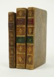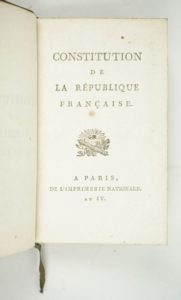 Constitution française présentée au Roi par l'Assemblée Nationale le 3 septembre 1791. Vienne, Chize et Pelisson, 1791. Un volume. 7,5 par 12 cm. 168 pages. Pleine basane d'époque, dos lisse, caissons ornés de bonnets phrygiens, pièce de titre rouge, plats encadrés d'une chainette dorée. Usure sur la coupe supérieure du 1er plat, coins usés, sinon bon état. Bon état intérieur. Précédée de la déclaration des Droits de l'Homme et du citoyen de 1789, c'est la première constitution française, issue des travaux de la Constituante. Elle fut acceptée par le Roi les 13 et 14 septembre 1791 (lettre et discours en fin de volume). Elle sera modifiée un an plus tard pour abolir la royauté. On joint : Lois relatives à la Constitution. Paris, imprimerie Nationale, An IV. Tomes 2 et 3. 7,5 par 12,5 cm. 324 et 196 pages. Plein veau d'époque, dos lisse orné, pièce de titre rouge, de tomaison noire. Très bon état. Il s'agit des lois organisées par la Convention (1792 à 1795). Il manque hélas le tome 1 Les 3 volumes