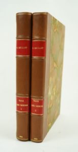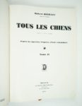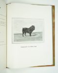 HEUILLET (Hubert) : Tous les chiens. Races & Standards. D'après les aquarelles originales d'André Lagarrigue. Toulouse, Frères Douladoure, 1934. Deux volumes. 22,5 par 29,5 cm. XII-501 ; 425 pages. Demi-basane havane moderne, dos 4 nerfs, pièces de titre et de tomaison rouges. Couvertures conservées. Parfait état de la reliure, parfait état intérieur. Tampons d'ancienne appartenance sur les pages de garde et en haut de pages intérieures. Absence des deux vignettes contrecollées sur les couvertures des deux tomes. Edition originale. Tirage limité à 975 ex. (N°368 et 561). Superbe ouvrage avec 186 illustrations en noir et blanc, et 33 en couleurs de chiens de toutes races. Chaque chien a en regard sa fiche descriptive, et sa notation pour estimer sa perfection