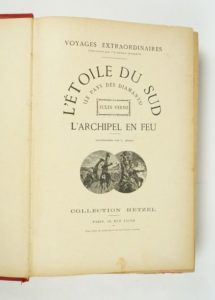 VERNE, Jules : L'Étoile du sud. L'archipel en feu... Dessins et une carte, par Benett., avec grandes gravures en couleurs. Paris, Collection Hetzel, sans date [vers 1910] Cartonnage polychrome à un éléphant avec "Voyages extraordinaires" dans l'éventail, et titre dans le cartouche. Dos au phare "d", second plat hybride (H et cie). 1er plat et dos en bon état, 2nd plat avec quelques taches. Papiers de garde intacts. Gorge avec quelques cahiers lâches, rousseurs sur certaines pages. Un cartonnage peu courant, dans un état acceptable.