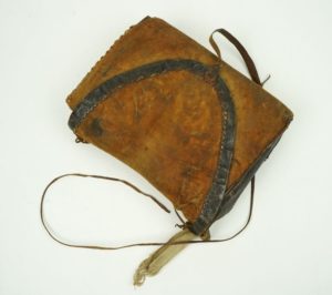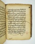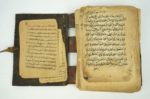 [Manuscrit] CORAN ancien. 19ème siècle. Un volume. 14,5 par 21 cm. Environ 400 feuillets (800 pages) non reliés, avec une belle écriture en noir et rouge. Dans une chemise en cuir artisanal, avec un lacet. Et un étui de voyage en peau de chèvre. Bon état intérieur pour la majorité des feuillets, bords parfois un peu effrités. Chemise et étui très patinés, un côté de l'étui manquant, usures. Un document conservé dans son étui d'origine, ce qui le rend très émouvant. Quelques motifs pour séparer des chapitres, des annotations plus ou moins stylisées dans les marges Des pages d'un format plus petit, présentes en tête d'ouvrage, ont été laissées telles quelles. Nous ne savons pas si le texte est complet Un beau document, arrivé jusqu'à nous dans sa protection d'origine