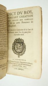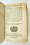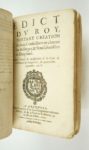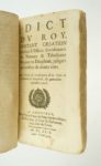 (Dauphiné.). Exceptionnel recueil factice des principaux édits de Louis XIII (neuf au total), imprimés séparément à Grenoble entre 1628 et 1630, mettant fin aux libertés dauphinoises garanties par l'acte de "transport" du Dauphiné au royaume de France de 1349. Soit 10 pièces imprimées séparément à Grenoble entre 1628 et 1630. Un volume. 10,5 par 16,5 cm. Plein vélin souple d'époque, en bon état (quelques taches claires sur le 1er plat, lacets absents). Quelques rousseurs intérieures, petits défauts superficiels, sinon très bon état. Ces différents édits sont rarissimes ; seule, la B.M. de Grenoble les possède tous. Richelieu, pour financer la guerre contre les protestants, sous prétexte de mettre fin à la querelle des tailles, affaiblit le Parlement de Grenoble et transforma le Dauphiné, pays d'États s'administrant lui-même, en pays d'Élections, où l'administration était exercée par des officiers, représentants directs du roi. Cette mesure fut pour le roi le cheval de Troie qui permit d'imposer l'État absolu. Détail du recueil : 1) Edict du Roy [mars 1628] portant création en tiltre d'office formé de deux présidens, dix conseilliers, deux secrétaires, & deux huissiers au Parlement de Dauphiné ; avec érection d'une quatrième Chambre en iceluy, & attribution de jurisdiction audit Parlement de la Cour des Aydes, & Finances de ladite province : portant aussi création de trois receveurs, & payeurs des gages des officiers dudit Parlement ; & règlement pour les procureurs de ladite Cour, finance, ou augmentation d'iceux. Avec l'arrest de vérification de la Cour de Parlement dudit pays, du 15 septembre 1628. Grenoble, Pierre Verdier, 1628, 14 pp. ; 2) Edict du Roy [mars 1628] portant establissement de la Chambre des Comptes de Dauphiné à l'instar de celle de Paris, & création en tiltre d'office dormé d'un conseillier du Roy Président, & cinq conseilliers du Roy & maistres des Comptes en ladite Chambre. Grenoble, Pierre Verdier, 1629, 15 pp. ; 3) Edict du Roy [décembre 1627] portant érection d'un bureau de trésoriers de France, et généraux des Finances en Dauphiné ; et création de six offices, tant de présidens, que trésoriers généraux en iceluy : un advocat, & un procureur du Roy ; deux greffiers ; et quatre huissiers. Avec l'arrest de vérification de la Cour de Parlement dudit païs, du 15 septembre 1628. Grenoble, Pierre Verdier, 1629, 23 pp. ; 4) Edict du Roy [juin 1627], portant création de deux conseilliers en chacun des balliages, & seneschaussées de Dauphiné. Avec l'arrest de vérification de la Cour de Parlement de Dauphiné, du quinzième septembre 1628. Grenoble, Pierre Verdier, 1629, 8 pp. ; 5) Edict du Roy [juillet 1628] portant création en tiltre d'offices, d'un conseillier procureur syndic général des trois ordres du païs de Dauphiné ; trois ses substituts : trois conseilliers trésoriers, & receveurs généraux : trois conseilliers conterooleurs [sic] desdits receveurs ; un conseillier syndic des communautez villageoises ; un son substitut : deux commis du clergé : deux conseilliers secrétaires : et un huissier. Avec l'arrest de vérification de la Cour de Parlement dudit pays, du 15 septembre 1628. Grenoble, Pierre Verdier, 1628, 11 pp. 6) [Recueil des édits du 2 décembre 1620, du 30 juillet 1622, du 5 septembre 1622 et du 3 décembre 1622, portant création en titre d'officiers receveurs des tailles de Dauphiné, leurs compétences, leurs gages et leurs rémunérations casuelles], 16 pp. ; 7) Edict du Roy [mars 1628], portant création de dix eslections en Dauphiné : avec un président ; un lieutenant ; un premier esleu assesseur ; quatre esleuz ; trois conterooleiurs esleuz ; un procureur, et un advocat du Roy ; trois receveurs des tailles, Aydes & taillon ; deux greffiers ; deux huissiers ; deux sergens ; et six procureurs postulants en chacune d'icelles. Avec l'arrest de vérification de la Cour de Parlement de Dauphiné, du 15 septembre 1628. Grenoble, Pierre Verdier, 1630, 25 pp. ; 8) Edict du Roy [mai 1627], portant création en tiltre d'offices héréditaires de notaires & tabellions royaux en Dauphiné, jusques au nombre de douze cens. Avec l'arrest de vérification de la Cour de Parlement de Dauphiné, du quinzième septembre 1628. Grenoble, Pierre Verdier, 1629, 8 pp. ; 9) Edict du Roy [11 décembre 1620], portant création des offices de garde des petits seaux, & gardenottes héréditaires en toute la province de Dauphiné. Vérifié au Parlement de Grenoble le 13 novembre 1622. Grenoble, Pierre Verdier, 1629, 28 pp. ; 10) Edict du Roy [juillet 1626], portant création des offices des gabelles à sel de cette province de Dauphiné. Avec l'arrest de vérification de la Cour de Parlement dudit païs du quinzième septembre 1628. Grenoble, Pierre Verdier, 1629, 24 pp.. Un ensemble très rare