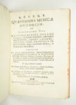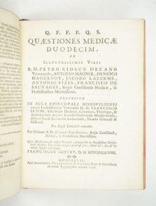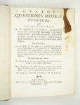 [Médecine] Recueil de l'ensemble des triduanes, imprimées en 1748 et en 1749, présentées par les sept concurrents pour la dispute de la chaire de Gerard Fitz-Gerald, devenue vacante à la suite de son décès le 10 janvier 1748. Cette chaire était l'une des quatre chaires généralistes créées en 1498 : elles portaient le nom de Régences. Ces triduanes étaient imprimées et intitulées : "Quaestiones medicae duodecim []. Pro regia cathedra vacante." Monspelii, Joannem Martel, 1748-1749 ; Augustinum Franciscum Rochard, 1749. Un volume. 17,5 par 22,5 cm. Paginations multiples. Plein veau d'époque, dos 5 nerfs, caissons ornés, pièce de titre rouge. Epidermures sur les plats, un manque en queue. Tache brune dans la marge extérieure des 4 premiers feuillets, sans atteinte du texte. Rousseurs éparses. Recueil fondamental pour l'attribution des chaires de médecine à Montpellier. Ce recueil est exceptionnel, les exemplaires complets de l'ensemble des triduanes d'un même concours sont rarissimes. "L'épreuve la plus décisive dans la dispute d'une chaire, est celle des triduanes. On donne ce nom à douze thèses qui doivent être soutenues dans l'espace de trois jours consécutifs, deux le matin et deux le soir. Pour composer et faire imprimer ces thèses, dont les sujets ont été assignés par les professeurs, juges de la dispute, on n'a que douze jours ; à peine sorties de la presse, on les distribue, et après un intervalle de quatre jours, on les soutient. La publicité qu'on leur donne par l'impression exige sans doute qu'elles soient travaillées avec beaucoup de soin ; mais fussent-elles un peu négligées, la brièveté du temps pourrait servir d'excuse." (Desgenettes, Éloges des académiciens de Montpellier, p. 290). Ce concours fut remporté par Charles Serane, qui fut titulaire de cette chaire jusqu'à sa mort (13 septembre 1756). (cf. Dulieu, La médecine à Montpellier). La page de titre des triduanes de Serane est reproduite par Dulieu t. III, 1ère partie, p. 40, celle de Gourraigne p. 88. Détail du recueil : 1) GOURRAIGNE (Hugues). Monspelii, Joannem Martel, 1748, (4)-26 pp.. Conlon 48 : 516. 2) SERANE (Charles). Monspelii, Joannem Martel, 1749, (2)-32 pp.. Conlon 49 : 848. 3) FITZ-MAURICE (Thomas). Monspelii, Joannem Martel, 1749, 29 pp.. Conlon 49 : 528. 4) PETIOT (Honorat). Monspelii, Augustinum Franciscum Rochard, 1749, 36 pp.. Conlon 49 : 777. 5) FARJON (Jacques). Monspelii, Augustinum Franciscum Rochard, 1749, 29 pp. + 1 papillon d'errata collé sur un feuillet blanc. Conlon 49 : 520. 6) LAMURE (François). Monspelii, Augustinum Franciscum Rochard, 1749, 52 pp.. Conlon 49 : 629. 7) IMBERT (François). Monspelii, Augustinum Franciscum Rochard, 1749, 42 pp. + 1 f. d'errata. Conlon 49 : 592.